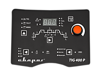 - Кнопка выбора способа сварки: TIG DC, TIG DC P, MMA DC