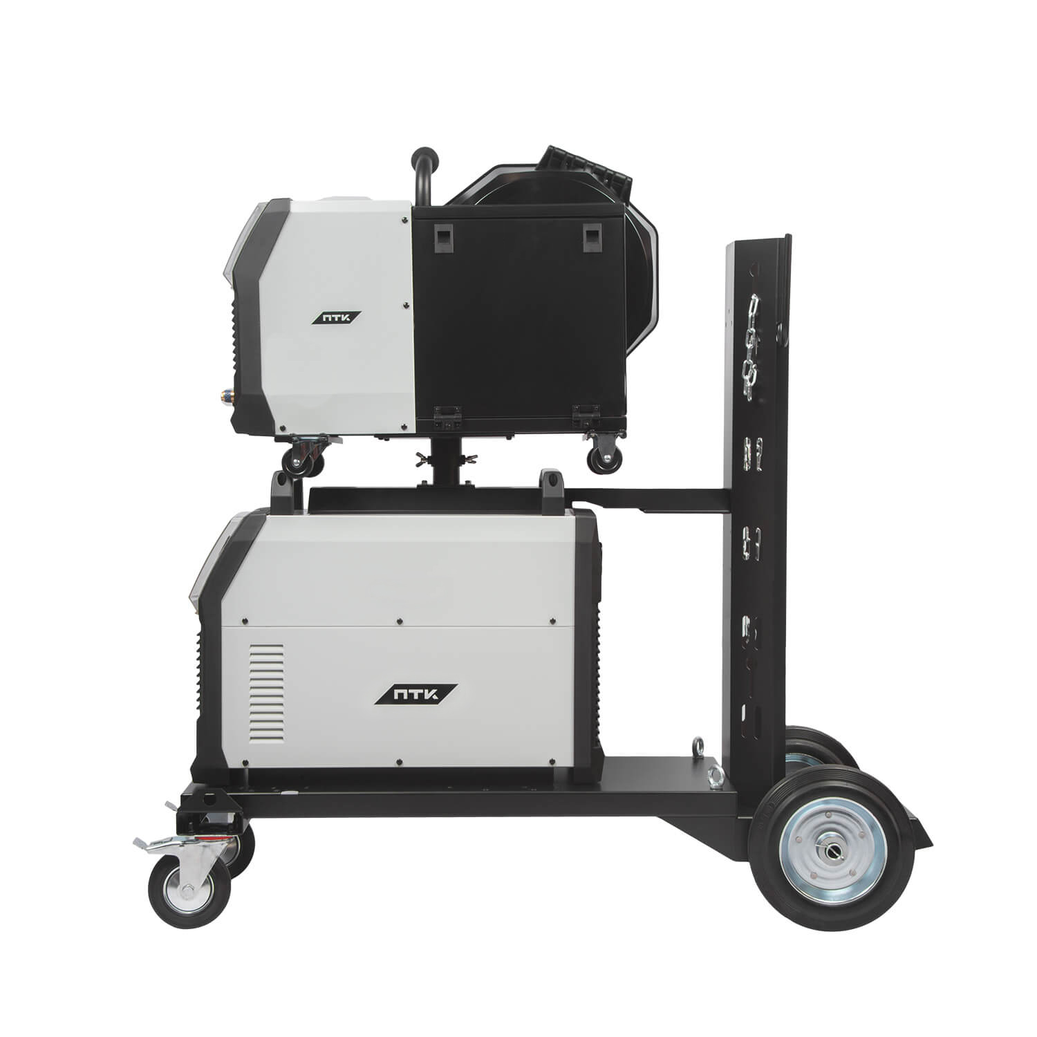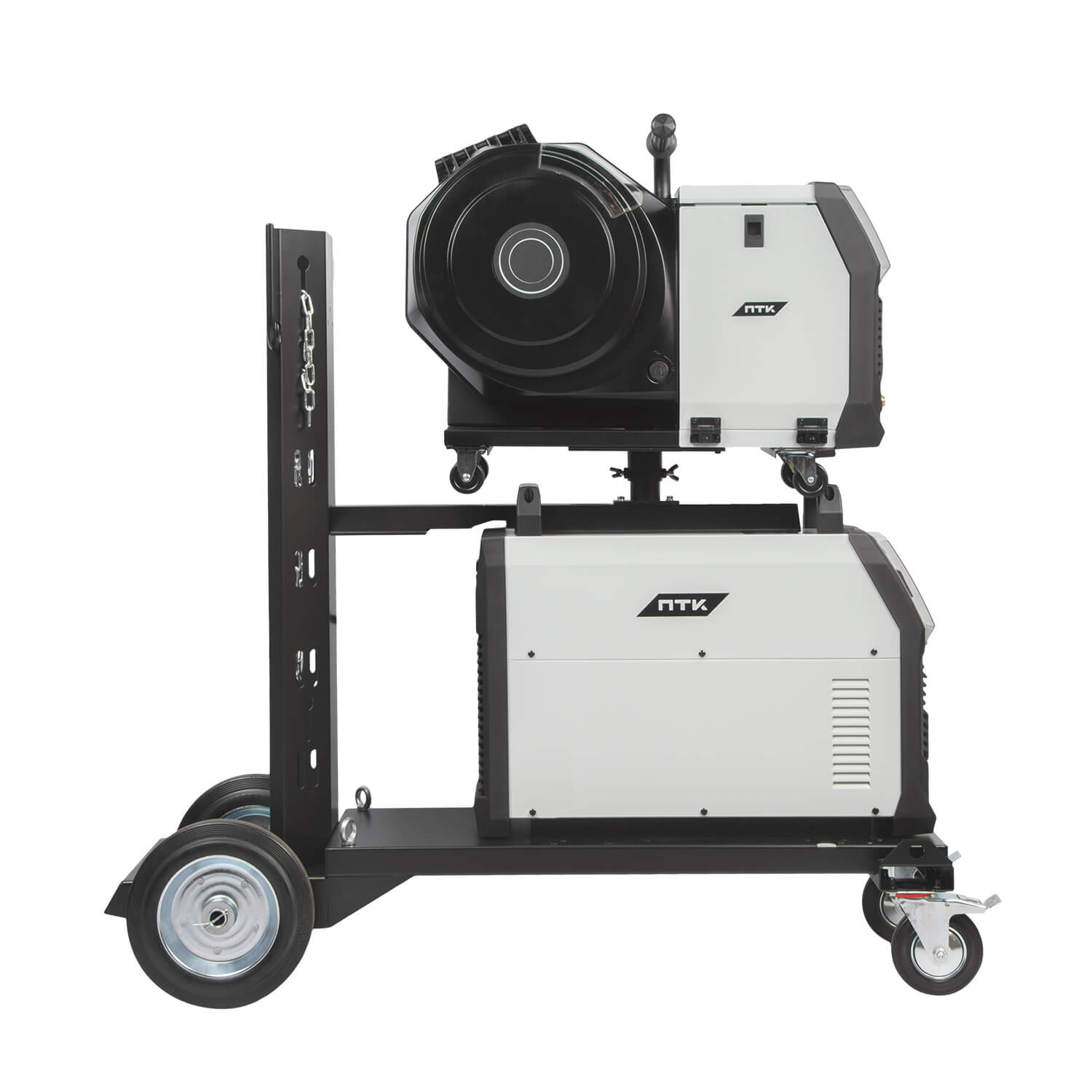 Оборудование поставляется в комплекте с тележкой для перемещения аппарата, подающего механизма и баллона с защитным газом. Тележка обладает надежной усиленной конструкцией, где толщина металла около 3 мм.